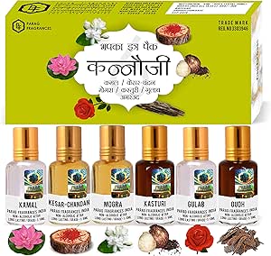 باراج فراجرانسيز عطور عطر كانوجي ميتي، كيسار-شاندان، موجرا، كاستوري وجولاب، وعود اجار عبوة عرض لفترة محدودة 6 مل × 6 قطع اجمالي 36 مل عطار / عطر يدوم طويلا وخالي من الكحول، للجنسين