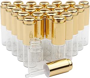 جيوو مجموعة من 25 قطعة 10 مل 1/3 اونصة من 25 قطعة، زجاجات قطارة زجاجية شفافة فارغة قابلة لاعادة الملء للزيوت العطرية للعلاج العطري ومستحضرات التجميل مع مضخة ضغط ذهبية وقطارة عين زجاجية