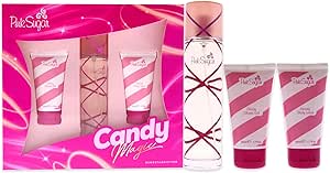 طقم هدية اكولينا للنساء من 3 قطع تشتمل على عطر بينك شوجر كاندي ماجيك او دي تواليت سعة 3.4 اونصة وجل استحمام لامع 1.7 ولوشن كريمي للجسم 1.7