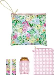 - تتميز حقيبة يوم الشاطئ بطباعة ليلي بالتزير باللون الزهري/الأخضر، Via Amore Spritzer، وتأتي معبأة بالكامل مع جميع الضروريات – مشبكان للكرسي للمنشفة، وغطاء مشروبات معزول، وحقيبة بسحاب من النايلون – لجعل رحلتك سهلة