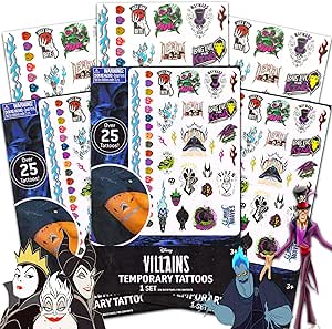 ديزني تاتوز مجموعة هدايا حفلات الأشرار ~ تتضمن العبوة 75 شريرًا مؤقتًا يضم ماليفيسنت اند مور (لوازم حفلات الأشرار)