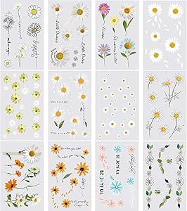 سيوسى تاتو مؤقت ثلاثي الابعاد بتصميم زهرة الاقحوان للنساء والفتيات، تاتو مزيف على شكل زهور لتزيين الجسم واليدين والرقبة والذراع والمعصم، 12 ورقة