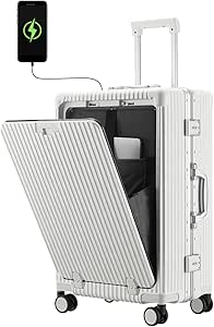 شنطة امتعة محمولة باطار من الالومنيوم متعددة الاستخدامات مع منفذ شحن USB جيب امامي قفل تي اس ايه سفر معتمدة شركات الطيران عجلات دوارة كاراني ابيض حقيبة حمل 22 × 14 9