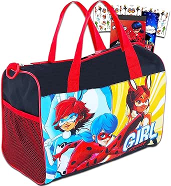 ميراكيلوس حقيبة دافل للأطفال بتصميم الدعسوقة – حزمة مع حقيبة سفر ميراكيلوس Ladybug مقاس 17 انش بالإضافة إلى ملصقات والمزيد (حقيبة ميراكيلوس ليديباج للبنات). تتضمن مجموعة حقائب السفر ميراكيلوس Ladybug حقيبة دفل مقاس 17 انش × 10 انش × 11 انش مع حزام كتف قابل للتعديل للحمل تتميز بعمل فني لشخصيات ميراكيلوس Ladybug المفضلة. حقيبة الدعسوقة من ميراكيلوس مثالية لأخذ كل ما تحتاجه معك بغض النظر عما إذا كنت ذاهبًا في إجازة طويلة إلى حديقة ترفيهية أو إلى منزل أحد الأصدقاء لحضور حفل نوم أو في الخارج لليوم. من المؤكد أنها ستكون ناجحة مع محبي ماي بي واي ليدي باج من جميع الأعمار، حقيبة السفر هذه رائعة لتقديمها كهدية لعشاق الدعسوقة المفضلة لديك. تتضمن مجموعة حقائب الدفل المرخصة رسميًا ملصقات الدعسوقة وشماعة باب بطل خارق.