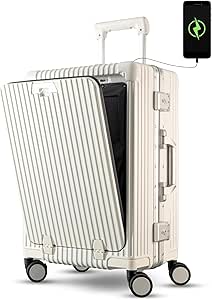 شنطة سفر فاخرة محمولة مع جيب امامي مفتوح للابتوب اطار من الالومنيوم حامل اكواب بدون سحاب ومنفذ USB للشحن وعجلات صامتة مقاس 20 انش تيريبلس® ابيض