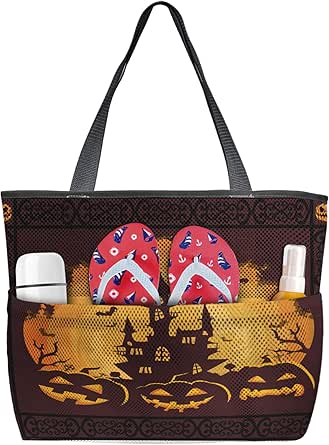 شنطة شاطئ شبكية شبكية بتصميم يقطين سبايدر من هانتد هاوس، شنطة شاطئ شبكية للهالوين مقاومة للرمال والنزهات الخارجية وحمام السباحة – شنطة شاطئ كبيرة بسحاب وجيوب