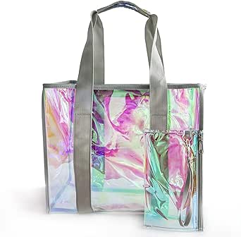 شنطة كتف كبيرة توت من توتي برينت نسخة مطورة وسميكة بتصميم هولوغرافي، شنطة شفافة مقاومة للماء للسفر والشاطئ (0.6 ملم بينك)