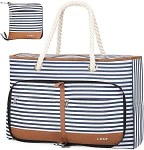 شنط شاطئ للنساء من توكوكيمو، شنطة دفل مقاومة للماء مع سحاب وجيب للسفر والشاطئ والتخييم (ازرق مخطط)