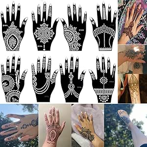 - 3) وضع اللصق: اليد، الإصبع. 1 مجموعة = 8 قطع استنسل الحناء و5 اليد اليسرى و3 اليمنى.