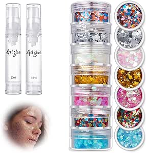 - ✨【استخدامات واسعة】رقائق جليتر مكتنزة لمستحضرات التجميل هذه مثالية لجسمك من الرأس إلى أخمص القدمين: الوجه والجسم وظلال العيون والشفاه والخدين والشعر وفن الأظافر والحرف اليدوية وأكثر من ذلك، مثالية لإكسسوارات الشعر الرائعة وبراقة الوجه. على الجسم، ضعي القليل من الغبار على عظام الترقوة والكتفين للحصول على تأثير لامع للغاية.