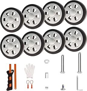 - استمتع بإصلاح عجلات صندوق السفر المكسورة – قم بحفر أو منشار برشام المحور القديم، قفل العجلات الجديدة باستخدام براغي المحور المضادة للفك والغسالات الاحتياطية (عند الحاجة)