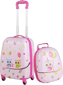 مجموعة شنط سفر سهلة الحمل للأطفال من اميرولين حقيبة بهيكل صلب مع ظهر شنطة دوارة صلبة بعجلات للأمتعة وحقيبة الأولاد والصغار زهري بنمط بومة