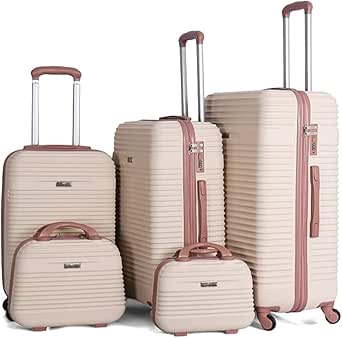 مجموعة شنط للجنسين مرنة بقفل جانبي مكونة من 5 قطع مع عجلات دوارة من في-ايت، باللون الابيض الكريمي, أبيض كريمي، بلاستيك