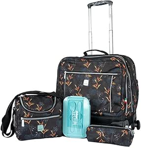 - حقائب بعجلات – تتضمن حقيبة غداء + مقلمة + صندوق غداء مع شوكة وملعقة. حقائب بعجلات – تتضمن حقيبة غداء + حقيبة أقلام + علبة غداء مع شوكة وملعقة
